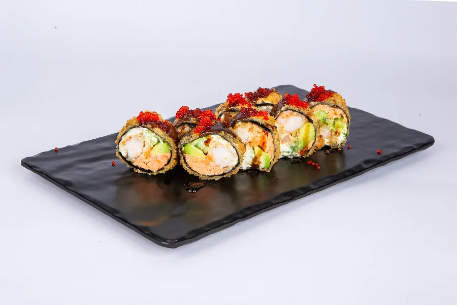 ახალი ორაგული, კრევეტი ტემპურაში, ნაღების ყველი, ტობიკო, ტერიაკის სოუსი, სალათის ფოთოლი, კიტრი, ნორი, ცომი, კვერცხი.