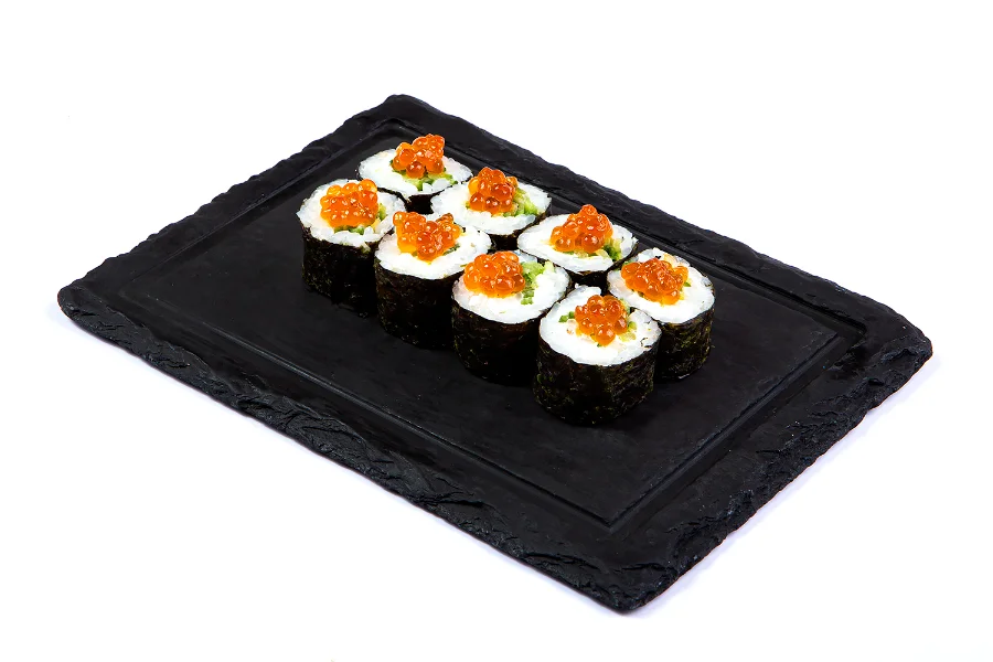 ორაგულის ხიზილალა, ბრინჯი, ნაღების ყველი, კიტრი, ნორი.
