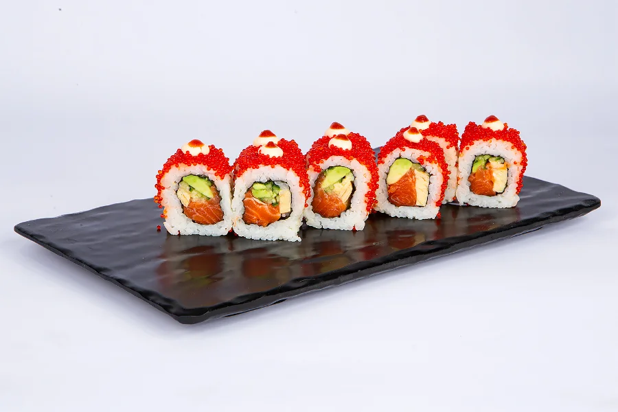 ახალი ორაგული, ცხარე სოუსი, კიტრი, ავოკადო, ტერიაკის სოუსი, ბრინჯი, ნორი, ტამაგო.