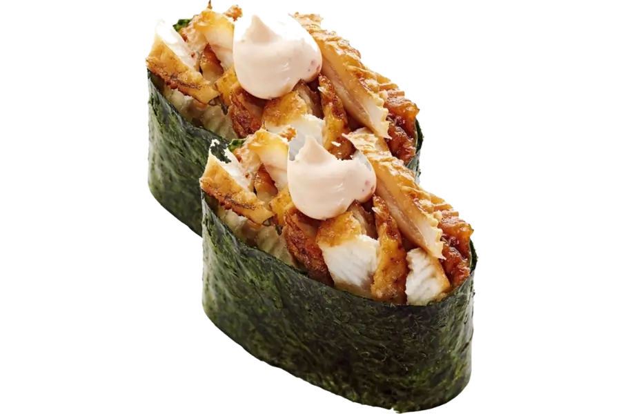 გველთევზა ცხარე სოუსი, ტერიაკის სოუსი, ნორი, ბრინჯი, სეზამი.